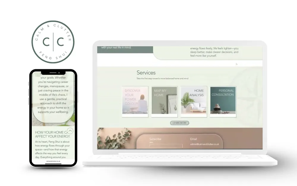 A calming, spacious design for a decluttering and Feng Shui consultant. The layout balances gentle visuals with practical info, helping busy women quickly see how Claire’s services can bring more energy, clarity, and calm to their homes — one space at a time.