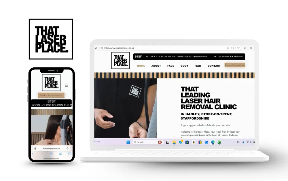 A bold, modern website for a fast-growing laser clinic in Stoke-on-Trent. Strong monochrome branding and sharp visuals help build trust and showcase their treatments. Fully mobile optimised with a clear layout, service pages and a simple sign-up form for enquiries and offers.